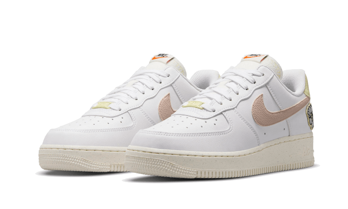 La Nike Air Force 1 Low ’07 SE Next Nature White Pink Oxford ha una base in Flyleather bianca. Uno swoosh in pelle granulata rosa pastello avvolge i pannelli della silhouette. Una linguetta giallo pastello adorna il tallone ed accuratamente abbinata al design allacciato. Diverse macchie di fiori e farfalle arricchiscono il disegno di Bruce Kilgore. Il tutto poggia su una suola beige con effetto speckle.