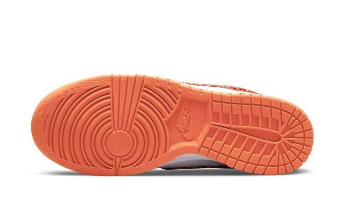 Là Nike Dunk Low Paisley essenziale orange offre una base in pelle bianca. Per le sovrapposizioni, il marchio americano ha optato per un pelle orange. Anche orange, lo swooh è accompagnato da a Modello di bandana bianca per tutta la sua lunghezza. In una versione leggermente meno appariscente, Nike ha anche rilasciato ilPAISLEY BACK BORY.