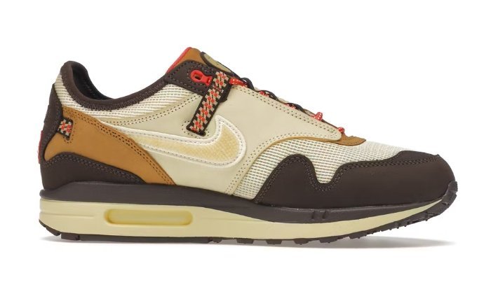 In collaborazione con l’etichetta discografica di Travis Scott, Cactus Jack, le Nike Air Max 1 Travis Scott Cactus Jack Brown si ispirano alle scarpe da trekking Nike ACG Pocket Knife. Hanno una tomaia in mesh a strati con rivestimenti in Durabuck tono su tono e loghi Swoosh invertiti. Il sistema di allacciatura Gillie richiama le trail runners. La suola Air completa il capolavoro.