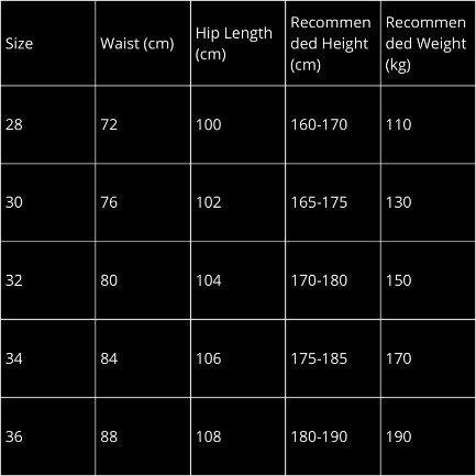 US28 EU44 S ,US30 EU46 M ,US32 EU48 L ,US34 EU50 XL ,US36 EU52 XXL |