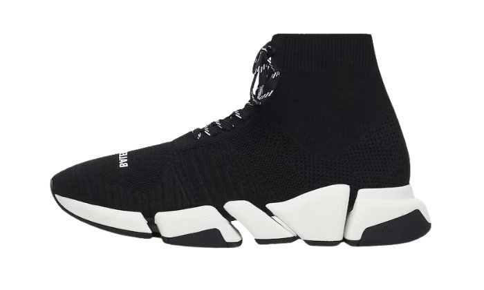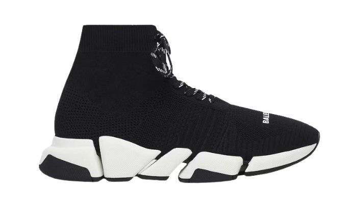 Le scarpe da ginnastica leggere Speed 2.0 di Balenciaga, con struttura a calza, offrono un design moderno e funzionalità essenziale. La tomaia in maglia nera è dotata di polsini a coste e suole in gomma testurizzata con tecnologia memory-sole.
