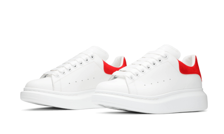 La Alexander McQueen Oversized Red se pare d’un ensemble blanc en cuir, accompagné d’un empiècement rouge en suède présent au niveau du talon avec l’inscription dorée « Alexander McQueen ». La semelle demesurée en caoutchouc, bien propre à la silhouette du modèle, est totalement vêtue de blanc. Le design est complété par le laçage droit grâce aux lacets plats blancs.
