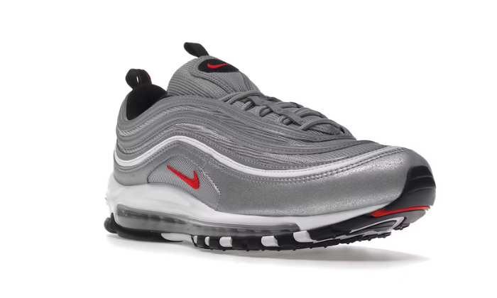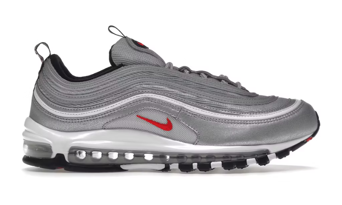 La Nike Air Max 97 OG Silver Bullet 2022 è disponibile in una miscela di quattro colorazioni: bianco, nero, rosso universitario e argento metallizzato.