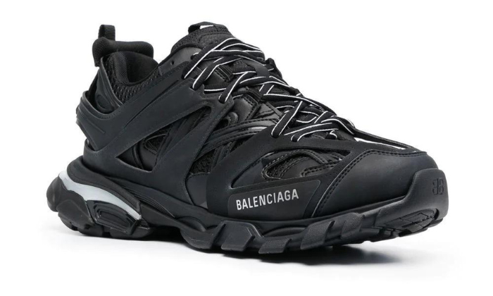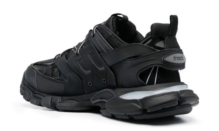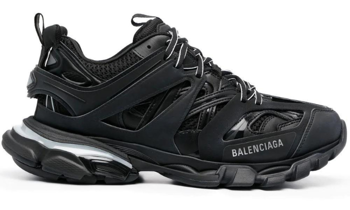 Prendendo ispirazione dagli anni ’90 e ’00, queste sneakers Track di Balenciaga sono realizzate con una combinazione di pannelli in nylon e mesh. Questo paio nero con lacci presenta la caratteristica suola in gomma lamellata, un riferimento nostalgico alle scarpe da corsa retrò.
